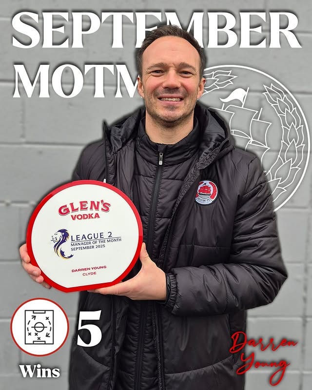 🏅 Clyde manager Darren Young and forward Marley Redfern won League Two Manager and Player of the Month for September. - SPFL website